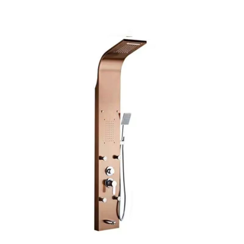 Hot Cold Mixer Water Shower 패널은 온도 조절기 및 계량 수도꼭지를 특징으로하여 정확한 온도 제어 및 물 사용 모니터링을 보장합니다. 매끄럽고 현대적인 디자인은 욕실 장식을 보완하는 반면, 세련된 표면 처리는 우아함을 더합니다.